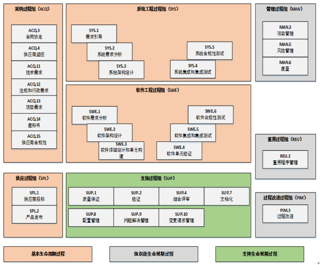在過程維度方面,A-SPICE PAM/PRM 3.0共包含了8個過程組的32個過程,如下圖所示: