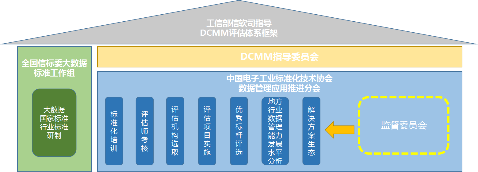 2019年7月,DCMM指導(dǎo)委員會成立,統(tǒng)籌DCMM工作,具體工作由中國電子工業(yè)標準化技術(shù)協(xié)會數(shù)據(jù)管理應(yīng)用推進(DCMM)分會實施,分會內(nèi)設(shè)監(jiān)督委員會監(jiān)督仲裁,不斷完善DCMM評估體系建設(shè),DCMM評估體系框架。